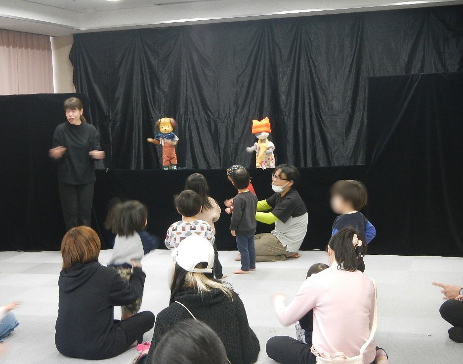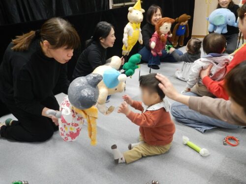 劇の最後は、人形たちが子どもの近くまで挨拶をしに来てくれて、ドキドキしながらも手を差し出す様子がありました。