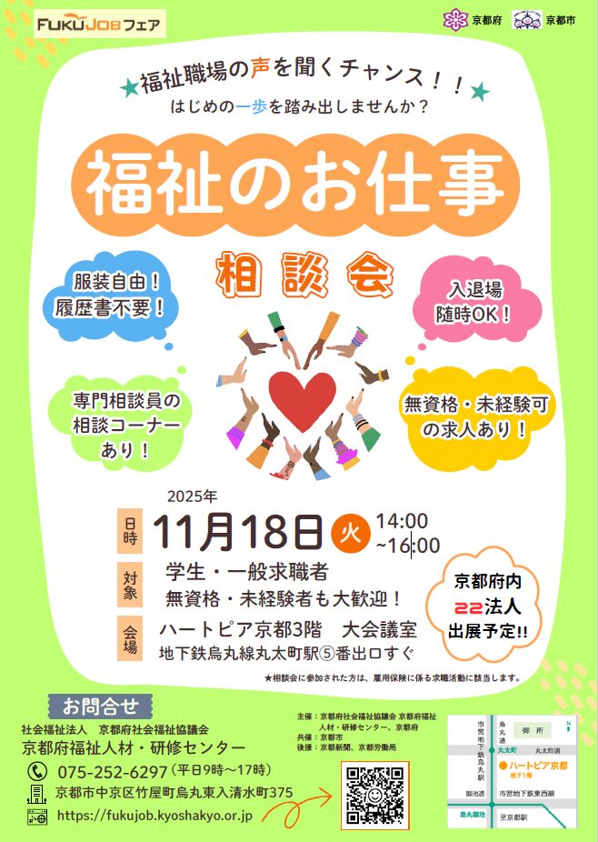 事務職員、支援職員、相談員等、複数職種の募集を行っていますので、ぜひ一度足をお運びください!